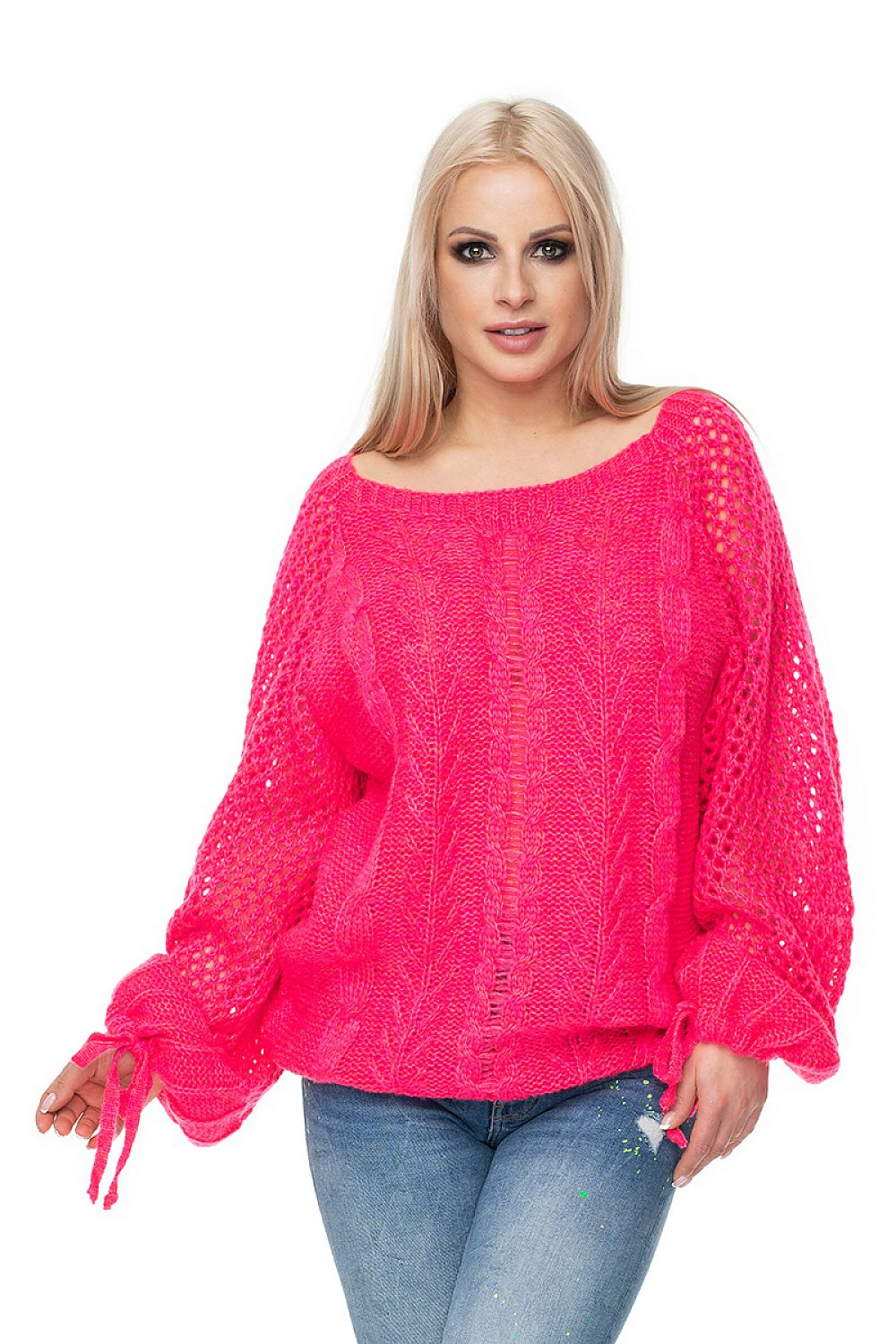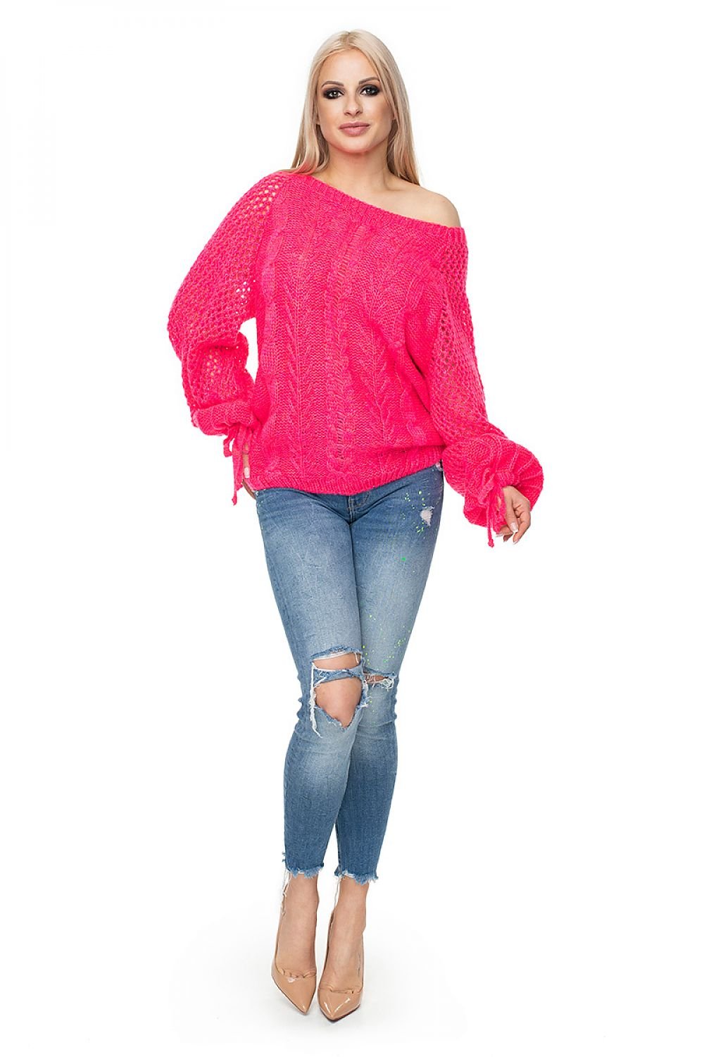 Sweater with wool in soft yarn. Sweater with openwork sleeves, with ties at the cuffs.