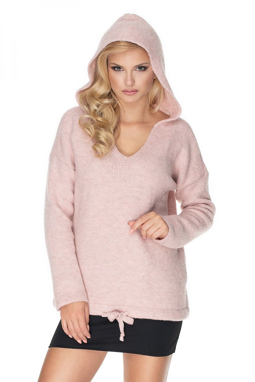 Hooded sweater, soft with a loose cut. Sweater with a heart neckline and a drawstring at the bottom.