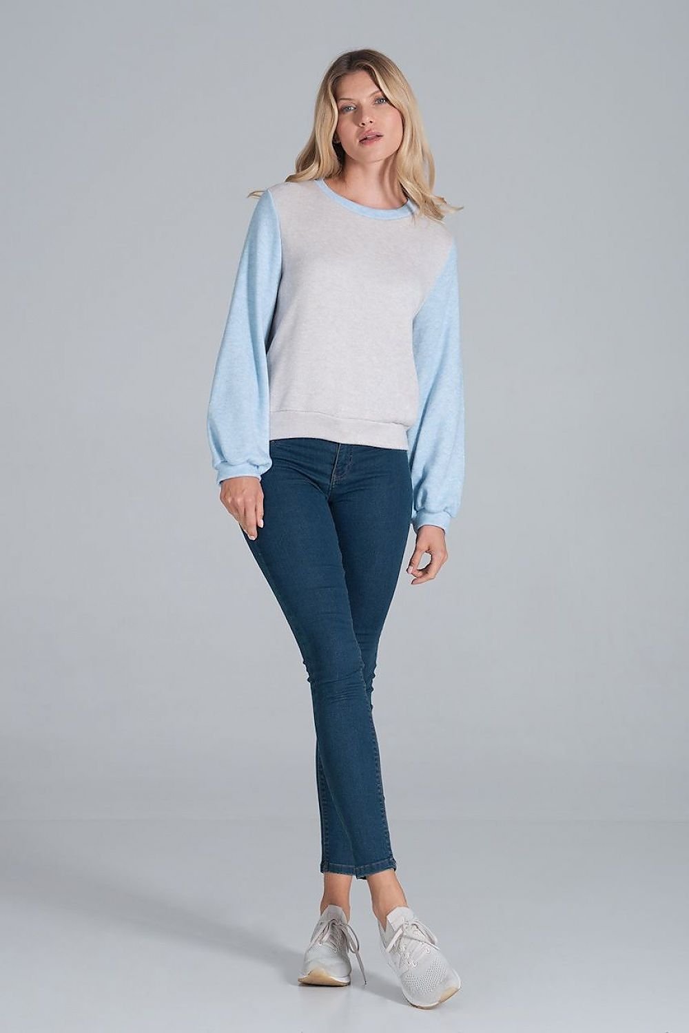Two-color, warm sweater with long sleeves. Buffed sleeves finished with a ribbed hem.