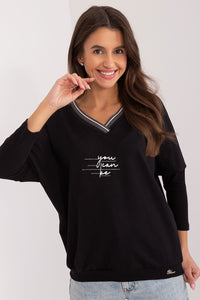 Introducing a blouse that combines reliable comfort with casual style, perfect for everyday wear. This blouse features a relaxed, casual style that is perfect for everyday situations. It is adorned with an original print on the front, adding an individual character and distinctiveness. Made primarily from high-quality cotton, it guarantees comfort, softness, and good ventilation, allowing the skin to breathe all day. The standard length of the blouse makes it versatile and suitable for different body types and styling. The 3/4 sleeves add lightness and elegance to the blouse, perfect for warmer days or layering. The V-neck with a contrasting ribbed trim gives the blouse a fashionable touch and makes it visually intriguing. Subtle studs placed on the front of the blouse add a unique shine and charm to it. This everyday blouse is not only a symbol of comfort and freedom but also a stylish element of your wardrobe. With its original print and accents, it will be a perfect complement to many everyday outfits, adding an individual character and distinctiveness to them.