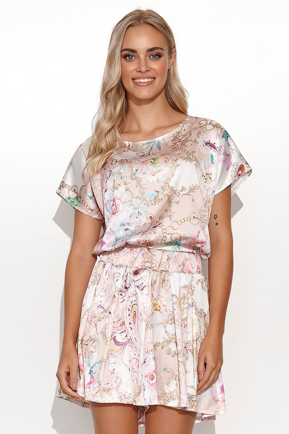 Extremely charming feminine summer set. The set consists of a short women's blouse and shorts made of satin fabric. The blouse has heavily cut short sleeves and a round neckline. It is quite short, so it will win the hearts of women who like to expose their belly in the summer. The set is accompanied by high-waisted shorts. Thanks to the thick elastic sewn on the waist line, they do not migrate during use. They are airy, perfect for hot days. For this set it is worth to wear shiny jewelry and elegant sandals. It is a perfect combination. The set comes in four variants, which differ in color and pattern.