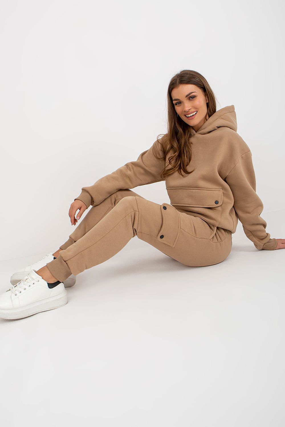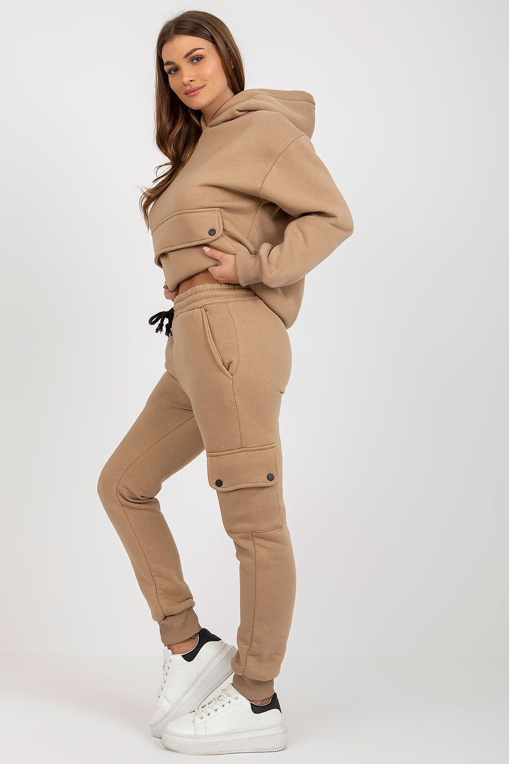 This set is an ideal choice for those who appreciate comfort and casual style. It consists of a sweatshirt and pants, creating a complete set for various occasions. Hooded sweatshirt with long sleeves is a great option for colder days. The hood adds a sporty touch, while the long sleeves provide warmth. On the front of the sweatshirt is a pocket with a flap, which gives it a bit of a military style. The cargo type long pants are not only comfortable, but also very practical. They have slip pockets that hold many small items, as well as thigh pockets that give them a distinctive look. In addition, the pants have a tie at the waist, which allows you to adjust them to your condition. This is a set that will work well for both everyday wear and outdoor activities.