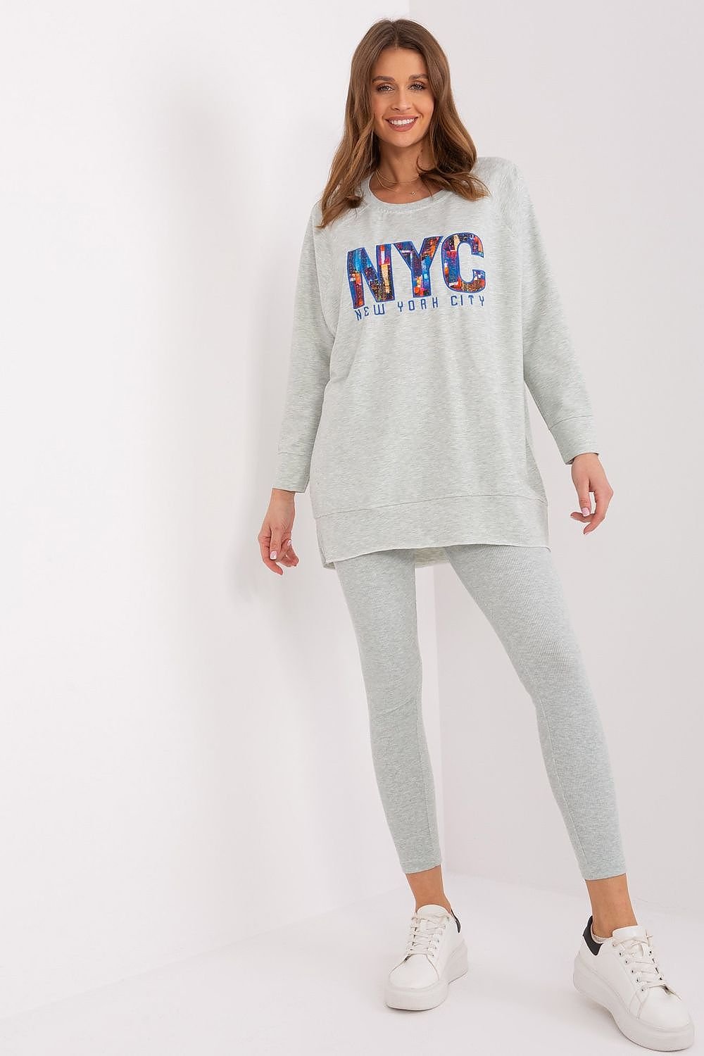 Women's set consisting of a sweatshirt and leggings is the perfect combination of comfort and style. The sweatshirt has a print on the front, which gives it a unique character and emphasizes the modern design. Made from a blend of high-quality cotton, polyester and elastane, it provides comfort and durability. Leggings are distinguished by a high waist, which perfectly emphasizes the waist and provides comfort during daily activities. The tapered legs perfectly fit the figure, and the ribbed material adds subtle texture and a fashionable look. The set will be perfect for everyday outings, walks or moments of relaxation at home. The combination of universal style and functionality makes it a great choice for any season.