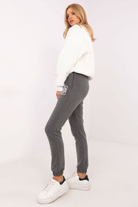 Women's casual sweatpants, perfect for everyday activities and relaxation. Made of a pleasant to the touch blend of cotton and elastane, providing comfort, flexibility and durability of the material. The pants have a high waist and a tie at the waist, allowing for a perfect fit to the silhouette. Cuffs on the legs give them a modern look and additionally increase the comfort of use. Side pockets are practical and allow for storing small items. The smooth fabric is complemented by subtle embroidery on the front, which adds style and uniqueness. These are perfect pants for women who appreciate comfort, functionality and trendy design all in one!